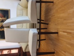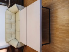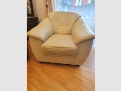 Alle Möbel sind in einem sehr guten Zustand, sie sind gebraucht (ca 4 Jahre) und alle cremefarbig. Alle Möbel sind aus echtem Leder und stammen aus einer Nichtraucher-Wohnung. Die Stühlbeine sind aus Holz. Abmessungen: Sofa mit Schlaffunktion Breite: 200 cm Tiefe: 90 cm Höhe: 60 cm (inkl Armlehnen) Sofa mit ausgestellter Schlaffunktion Liegefläche: 190 cm Sessel Breite: 92 cm Tiefe: 102 cm Höhe: 85 cm Stühle Gesamthöhe: 102 cm Nur Selbstabholung in Stuttgart-Bad Cannstatt - Gesamtpreis: 450 Euro Kontakt: 0711 55 90 54 2 Herr Stanislaw Duda