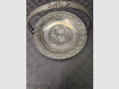 Zinnteller mit Griff/Henkel SKS Zinn 95 % Mann sitzt an der Mühle Mit Punze 1921 Schöner Spruch 13 cm mit Henkel 20 cm Durchmesser