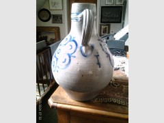 Artkunst24-de biete: Antike dekorative große fein gestempelte Westerwälder Steinzeugkanne,H 35 cm.18 Jhdt. Vorne und an den Seiten der Wandung jeweils 7 große gestempelte Blüten,in der Mitte blau ausgemalt. Stark geriffelter Wulsthenkel mit Ansatz ,daneben eine Malersignatur. Für das Alter noch gut erhalten. Höhe: 35 cm
