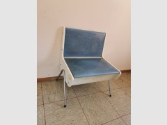 In der Küche meiner Oma steht eine blaue Küchen - Sitzbank aus den 1960er Jahren mit blauem Vinylbezug und Metallbeinen. Oben an der Kante der Lehne ist ein etwa 10cm langer Riss im Bezug. Unter der Sitzfläche befindet sich ein Staufach. Maße: 63,5 breit, 57cm tief, 79cm hoch