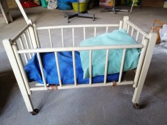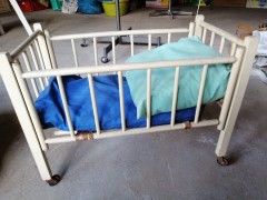 Puppenbett ca.50 Jahre alt, Aufhängung für den Boden etwas reparaturbedürftig. Größe: L 61cm x B 34 cm x H 46