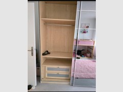 Eine sehr gepflegte kleiderschrank(250x300) mit 3 Bereichen mit innen Schubladen und Innenausstattung sehr schwer die spiegeln sind in dunkelgrau nur bei der rechten Seite gibt es eine Mängel der ist unter Schublade der Boden leicht reingedrückt nach abbau und wieder Aufbau kann man die stabilisieren