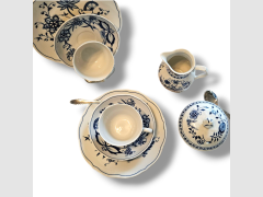 Kaffeeservice mit Zwiebelmuster umfasst 12 Tassen, 12 Untertassen, 12 Dessertteller sowie eine Zuckerdose mit Deckel und 2 Milchkännchen. Vintage, Retro, DDR, Teeset Spülmaschinenfest